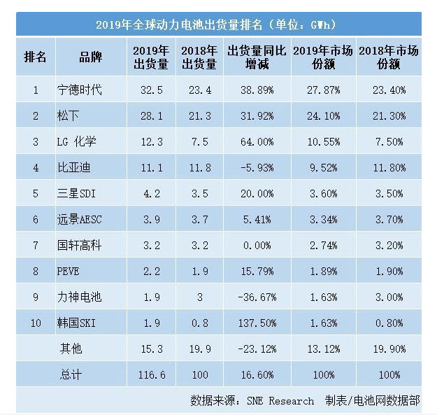 2019年全球動(dòng)力電池出貨量TOP10企業(yè)分別是寧德時(shí)代(出貨量32.5GWh,市場(chǎng)份額27.87%)、松下(出貨量28.1GWh,市場(chǎng)份額24.1%)、LG化學(xué)(出貨量12.3GWh,市場(chǎng)份額10.55%)、比亞迪(出貨量11.1GWh,市場(chǎng)份額9.52%)、三星SDI(出貨量4.2GWh,市場(chǎng)份額3.6%)、遠(yuǎn)景AESC(出貨量3.9GWh,市場(chǎng)份額3.34%)、國(guó)軒高科(出貨量3.2GWh,市場(chǎng)份額2.74%)、豐田旗下PEVE(出貨量2.2GWh,市場(chǎng)份額1.89%)、力神電池(出貨量1.9GWh,市場(chǎng)份額1.63%)、韓國(guó)SKI(出貨量1.9GWh,市場(chǎng)份額1.63%)。其中,中國(guó)電池廠商占據(jù)了5個(gè)席位,相較2018年減少了2個(gè)。