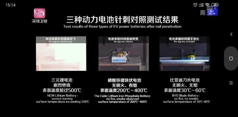 王傳福介紹,刀片電池具有高安全、長壽命、長續(xù)航的優(yōu)勢,是比亞迪基于磷鐵酸鋰技術(shù)的又一次創(chuàng)新。其體積能量密度與主流三元鋰電池持平,在相同體積下所儲存的電量也相差無幾,但安全性表現(xiàn)卻遠(yuǎn)遠(yuǎn)超出三元鋰電池。在針刺試驗中,刀片電池針刺點附近位置僅有較低程度的溫升變化,基本杜絕了出現(xiàn)燃爆的可能。