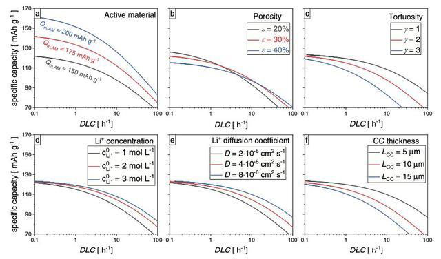 那么究竟是什么因素限制了高能量密度的電池的倍率性能呢?該因素是否能進(jìn)行量化表征呢?近日,德國(guó)德累斯頓工業(yè)大學(xué)的Christian Heubner(第一作者,通訊作者)對(duì)鋰離子電池倍率性能的限制因素進(jìn)行了研究,分析表明Li+的擴(kuò)散是限制鋰離子電池倍率性能的主要因素,可以通過簡(jiǎn)單的模型對(duì)擴(kuò)散限制極限倍率DLC進(jìn)行計(jì)算,為倍率型鋰離子電池的設(shè)計(jì)提供指導(dǎo)。