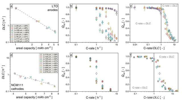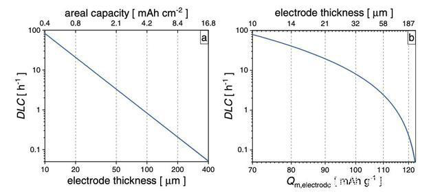 實(shí)際上作者也發(fā)現(xiàn)幾乎所有的實(shí)驗(yàn)數(shù)據(jù)都表明,當(dāng)電極的倍率超過了DLC后其容量發(fā)揮都會(huì)顯著的降低,因此盡管DLC的定義比較簡(jiǎn)單,但是卻能夠很好的預(yù)測(cè)電極的倍率性能。當(dāng)然在實(shí)際電極設(shè)計(jì)中還存在尚未達(dá)到DLC,電極的容量發(fā)揮就出現(xiàn)顯著降低的現(xiàn)象,這主要是電極在設(shè)計(jì)中未充分考慮電荷交換、歐姆阻抗和Li+遷移數(shù)等其他限制因素。