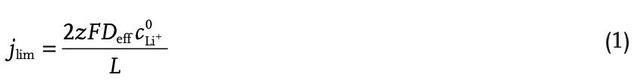 電池的擴(kuò)散限制極限電流Jlim可以通過菲克定律和法拉第定律計(jì)算得到(如下式所示),在下式中z為L(zhǎng)i+電荷數(shù),F(xiàn)為法拉第常數(shù),CoLi+為初始Li+濃度,L為電極的厚度,Deff為電極的有效擴(kuò)散系數(shù)。
