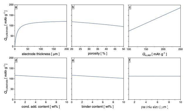 鋰離子電池電極主要由活性物質(zhì)顆粒、粘結(jié)劑、導(dǎo)電劑和集流體等成分構(gòu)成,電極內(nèi)部包含大量的微孔,在鋰離子電池內(nèi)部這些微孔被電解液所填充,上圖展示了電極平均的比容量(包含粘結(jié)劑、導(dǎo)電劑和集流體重量)與電極厚度、孔隙率、正極活性物質(zhì)比容量、導(dǎo)電劑含量、粘結(jié)劑含量和顆粒尺寸之間的關(guān)系,從圖中能夠看到孔隙率、導(dǎo)電劑和粘結(jié)劑的比例、活性物質(zhì)粒徑對(duì)于電極的比容量影響比較小,而電極的厚度和正極活性物質(zhì)比容量對(duì)于電極的平均比容量則有著比較大的影響。