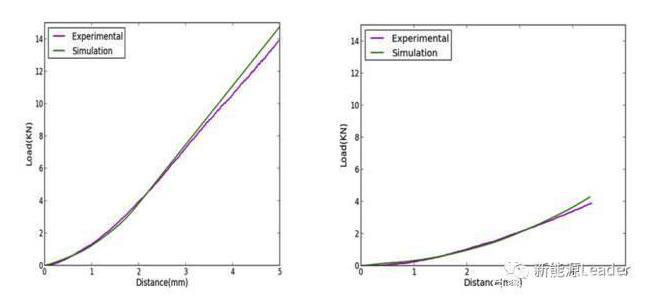 對擠壓試驗中單個電池和三個電池疊放模型進(jìn)行模擬的曲線如下圖所示,其中左邊的為單只電池,右邊的為三只電池疊放在一起,從圖上可以看到模擬結(jié)果與試驗結(jié)果十分接近。由于三只電池疊放在一起,單只電池受到的載荷明顯減小。