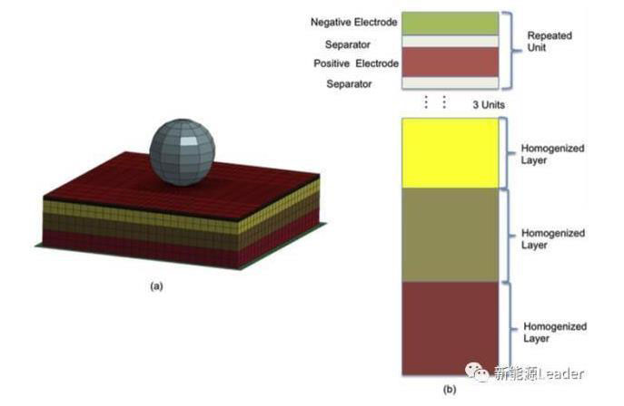 為了研究造成擠壓試驗中電池短路的原因,Hsin Wang利用FEM軟件對電池的擠壓造成的熱失控進(jìn)行了研究。模型分別對單只電池和三只電池疊放在一起的情況進(jìn)行了研究。Hsin Wang采用MAT-63材料模型對電極進(jìn)行了模擬,擠壓球采用了剛性球模型,接觸點(diǎn)則采用了實(shí)體接觸模型,摩擦系數(shù)為0.3,具體模型如下圖所示。