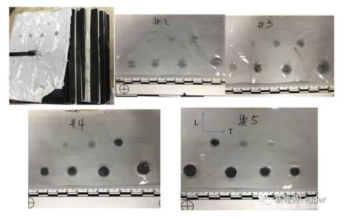 通過對擠壓試驗后的電池進(jìn)行拆解,拆解后的隔膜圖片如下圖所示,從圖上可以看到隨著變形量的增大,隔膜逐漸變薄,同時由于隔膜在橫向和縱向上的強(qiáng)度不同,使得壓痕呈現(xiàn)橢圓形而不是圓形,該結(jié)果顯示隔膜變薄可能是導(dǎo)致擠壓試驗中電池短路發(fā)生的主要原因。