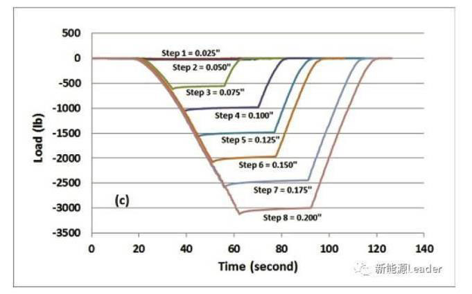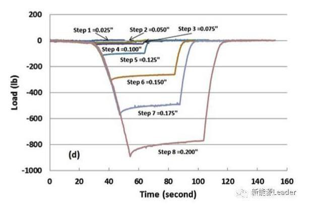 三只電池疊放在一起的載荷vs時間曲線如下圖所示,從圖上可以看出由于三只電池疊放在一起,提供了很大的緩沖,因此在開始變形量較小時,加在電池上的載荷十分?。?lt;50磅),從Step 4開始,變形量達(dá)到0.1英寸時,電池才開始產(chǎn)生較大的線形載荷,同時我們也從兩圖中注意到在相同的變形量下,三只電池疊放在一起時電池受到的載荷明顯要小于單只電池受到的載荷。進(jìn)一步的研究顯示,當(dāng)三只電池疊放在一起時,電池最大的變形量可以達(dá)到單個電池厚度的90%。