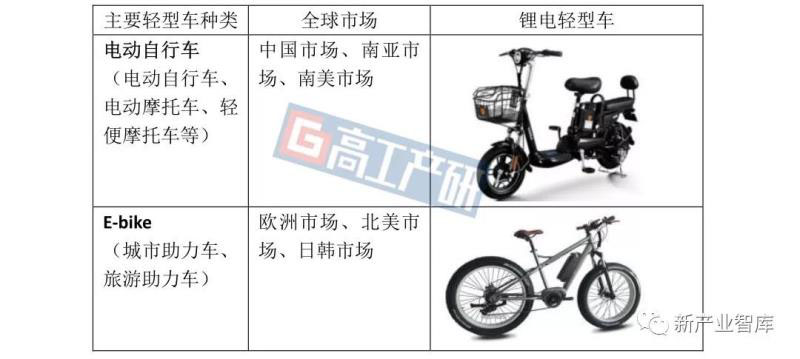 鋰電輕型車從類型上來劃分,主要有電動自行車、電動摩托車、輕便摩托車、E-bike,除去南亞和中國市場以電動自行車、電動摩托車、輕便摩托車為主要類型外,歐洲市場、北美市場以及日韓市場均以E-bike助力車為主要的鋰電輕型車。