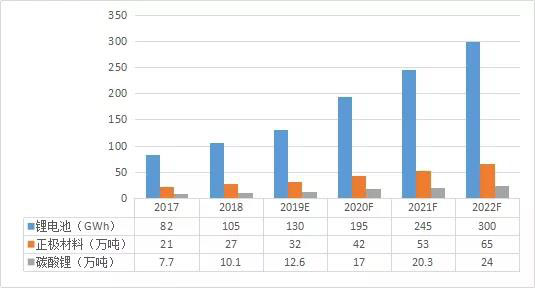 其消耗碳酸鋰量為10.1萬噸(一噸不同類型的正極材料需消耗碳酸鋰量為0.3~0.42噸),同比增長32%。預(yù)計到2022年中國鋰電池產(chǎn)量將達(dá)300GWh,消耗碳酸鋰量將達(dá)到24萬噸,年復(fù)合增長率超過24%。