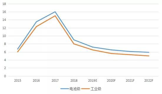 預(yù)計未來隨著各大企業(yè)的擴(kuò)張和鹵水提鋰技術(shù)的進(jìn)步,其價格到2022年將跌至5萬元/噸(工業(yè)級),6萬元/噸(電池級)。