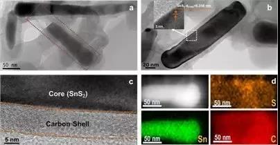 實驗室通過一系列的微觀結構表征揭示了所增長的容量來源于碎化的SnS2晶粒界面,而碎化的晶粒被碳納米管包覆約束,保持良好的導電網絡,這在該項研究中被實驗室稱之為“口袋效應”。以此新型負極材料組裝的鋰離子電池具有優(yōu)異的儲鋰性能和安全系數,是目前商業(yè)化鋰離子電池(碳基負極材料)容量的3-7倍,并且在0-60oC下穩(wěn)定運行。