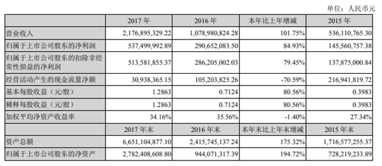 2017年,受國家對新能源汽車發(fā)展政策以及下游鋰電池生產(chǎn)企業(yè),尤其是國內(nèi)、國際高端鋰電池生產(chǎn)企業(yè)投資速度加快、規(guī)模持續(xù)擴大趨勢的影響,先導(dǎo)智能鋰電設(shè)備業(yè)務(wù)增長明顯,這是先導(dǎo)智能業(yè)績增長的主要動因。在2017年全年的報告期內(nèi)實現(xiàn)營業(yè)收入217,689.53萬元,同比增長101.75%;歸屬于上市公司股東的凈利潤53,750.00萬元,同比增長84.93%;鋰電池生產(chǎn)設(shè)備收入占比83.72%,得益于國家對新能源行業(yè)的大力支持,鋰電池生產(chǎn)設(shè)備行業(yè)在未來3-5年還會高速發(fā)展。