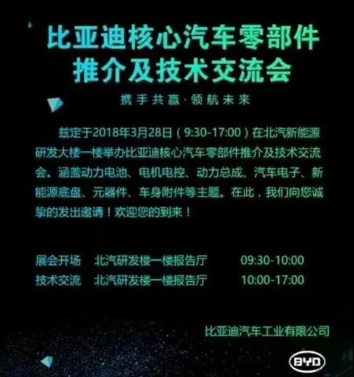 有消息稱,比亞迪將在北汽新能源研發(fā)大樓舉辦比亞迪核心汽車零部件推介及技術(shù)交流會,其中竟涵蓋了動力電池、電機(jī)電控、動力總成、汽車電子、新能源底盤、元器件、車身附件等主題。這個交流會的地點(diǎn)以及內(nèi)容都相當(dāng)耐人尋味。