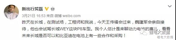 2018年3月20日,有媒體報(bào)道稱,比亞迪董事長王傳福到訪保定,長城老總魏建軍親自接待,并且還試駕了長城旗下的WEY P8新能源SUV。長城總裁魏建軍以自己姓氏為品牌,由前寶馬設(shè)計(jì)師傾力打造的打造“WEY”品牌,是長城決戰(zhàn)在新能源汽車未來的重磅武器。