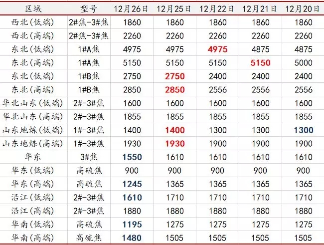 周二(12月26日)市場區(qū)域焦價價差拉低 低硫煅燒焦價格繼續(xù)上揚