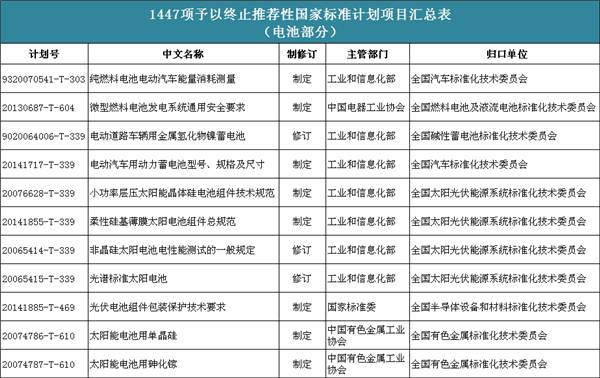 另外,2017年12月15日,國家標(biāo)準(zhǔn)委發(fā)布了《關(guān)于廢止<發(fā)文稿紙格式>等873項推薦性國家標(biāo)準(zhǔn)的公告》,其中,有5項電池類推薦性標(biāo)準(zhǔn)被廢止,它們分別是:
