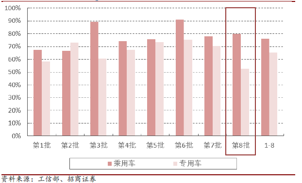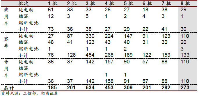 目錄車型數(shù)量略有下滑:工信部9月1日如期公布了第8批目錄,本批目錄共95家企業(yè)的273個(gè)車型入選,環(huán)比略有3%的下滑。目前已發(fā)布的前8 批目錄累計(jì)已超過去年全年水平。