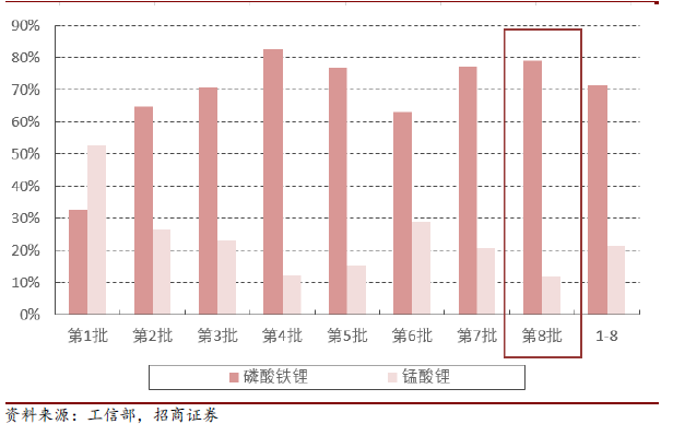 招商證券認(rèn)為,本批次乘用車與專用中,三元應(yīng)用比例分別為80%、53%,環(huán)比有所下滑,但仍保持著主流地位。磷酸鐵鋰保持著在客車中的絕對(duì)占比優(yōu)勢(shì),同時(shí)專用車中磷酸鐵鋰的使用顯著增多,占比已由第7 批的28%提升至41%。