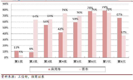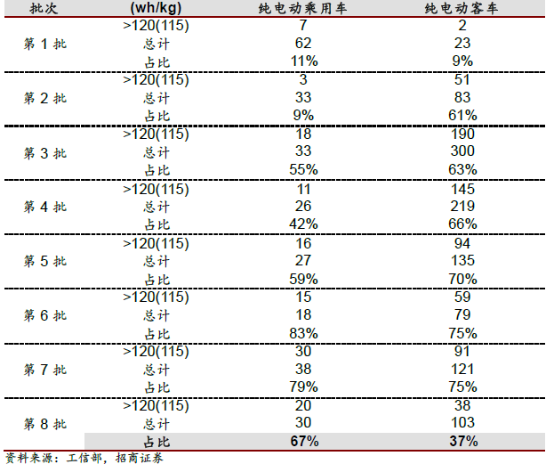 據(jù)調(diào)研,在第8批目錄中,符合1.2倍補(bǔ)貼要求的純電動(dòng)乘用車比例為67%,較第6, 批有所下降,但是高于前5批的水準(zhǔn)。客車中高能量密度的占比下降為37%,整體呈現(xiàn)向中密度集中的趨勢(shì)。