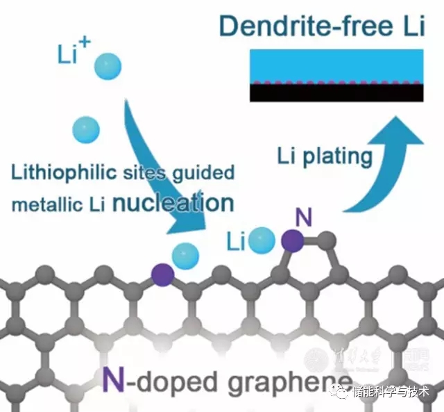 通過摻氮石墨烯上具有親鋰性的含氮官能團(吡啶氮、吡咯氮等)作為形核位點,促進電解質(zhì)中的鋰離子在充電開始時優(yōu)先吸附在導電親鋰的位點上進而沉積形成均勻分布的金屬鋰形核點,在后續(xù)充電過程中,鋰離子將基于這些均勻形核點進行均勻沉積。