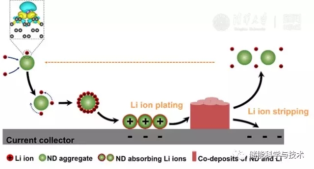 當在電解液中添加少量納米金剛石顆粒時,這些粒子可以在電場和流體的傳送作用下到達負極表面,并均勻分布。這些均勻分布的納米金剛石與鋰離子具有強吸附作用,將會吸附鋰離子,成為鋰離子的形核點并誘導鋰離子在這些點的沉積。由于鋰離子在納米金剛石表面的擴散勢壘很小,鋰離子傾向于在納米金剛石表面均勻沉積。