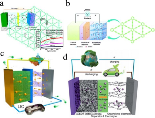 石墨炔材料在鋰離子電池(a,b)、鋰離子電容器(c)及鈉離子電池(d)中的應(yīng)用