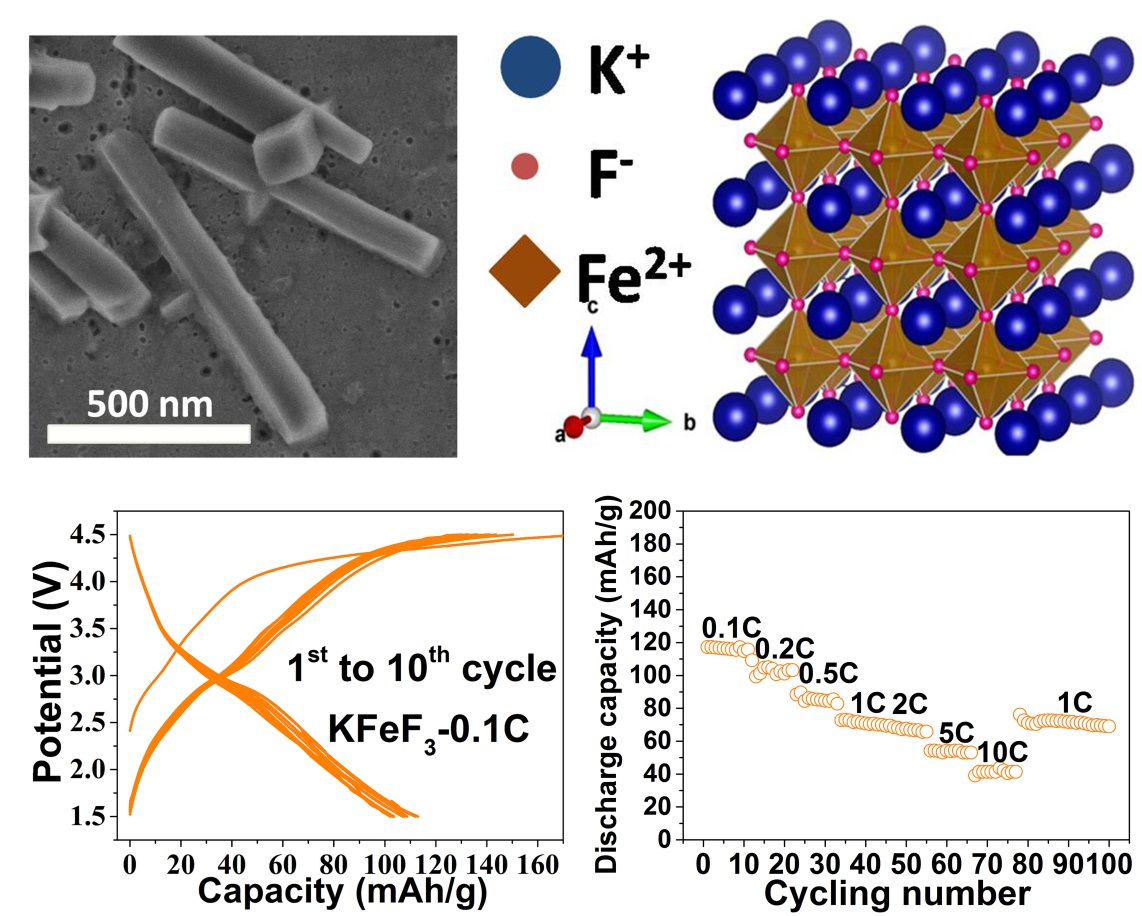 立方鈣鈦礦是近年來太陽能電池、燃料電池和電催化的研究熱點(diǎn),但之前由于其密結(jié)構(gòu)特點(diǎn)很少被嘗試用作儲能電極。事實(shí)上,健壯構(gòu)架的鈣鈦礦相具有本征的三維擴(kuò)散通道,但是以前報道的NaFeF3中的Na填充通道較窄,導(dǎo)致Fe-F八面體晶格扭曲,使某些方向的通道變得更窄,影響其儲鈉高倍率的實(shí)現(xiàn)。為了實(shí)現(xiàn)鈣鈦礦相的規(guī)整化和開框架化,該團(tuán)隊(duì)提出用等摩爾數(shù)的K+取代Na+作為通道填充劑,通過液相方法合成了一種立方相的KFeF3。KFeF3作為3V區(qū)間正極,實(shí)現(xiàn)了晶體結(jié)構(gòu)的高度對稱性和各向同性的三維快速離子通道,其表現(xiàn)出固溶反應(yīng)(近零應(yīng)力)的電化學(xué)行為和高的本征擴(kuò)散系數(shù)(7.9–9.8×10?11cm2s?1),從而使可逆儲鈉容量在0.1、2和10 C下分別可達(dá)110、70和40 mAh g?1,這也是目前所報道的氟化物儲鈉的最高倍率性能。同時,該團(tuán)隊(duì)首次將這一氟化物作為鉀離子電池正極材料進(jìn)行測試,在0.5 C下有60mAh/g的穩(wěn)定放電容量。