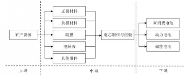 鋰電池行業(yè)上游是鋰電池材料所需的礦產(chǎn)資源,包括鋰礦、鎳礦、鈷礦、錳礦以及石墨礦等;中游為鋰電池生產(chǎn)廠商,包括正極材料、負(fù)極材料、電解液、隔膜、導(dǎo)電劑和粘合劑的生產(chǎn)商等,下游主要是鋰電配套應(yīng)用領(lǐng)域,目前已廣泛用于 3C 消費(fèi)類電子產(chǎn)品、電動(dòng)汽車、工業(yè)儲(chǔ)能等領(lǐng)域。