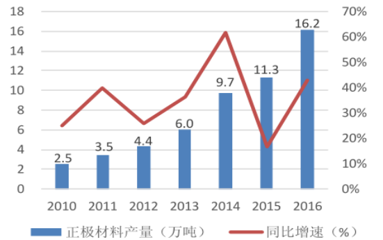 受動(dòng)力電池市場(chǎng)持續(xù)增長(zhǎng)影響,2016年我國(guó)鋰電池正極材料產(chǎn)量16.16萬(wàn)噸長(zhǎng),同比增長(zhǎng) 43% ,其中,磷酸鐵鋰正極材料產(chǎn)量5.7 萬(wàn)噸,同比增長(zhǎng) 75% ;三元正極材料產(chǎn)量5.43 萬(wàn)噸,同比增長(zhǎng) 49% ,兩者增長(zhǎng)主要由動(dòng)力電池需求拉動(dòng),鈷酸鋰產(chǎn)量 3.49 萬(wàn)噸,同比增長(zhǎng) 9.4%,主要受 3C 消費(fèi)電子產(chǎn)品拉動(dòng)。