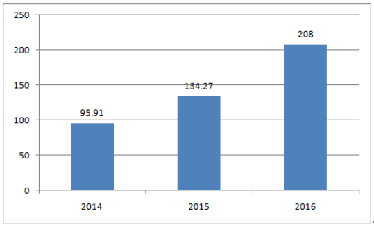 受正極材料市場(chǎng)價(jià)格上漲影響,2016 年正極材料產(chǎn)值208 億元,同比增長(zhǎng) 54.91% ,產(chǎn)值增速大于產(chǎn)量增速。其中,三元材料產(chǎn)值接近 80 億元,磷酸鐵鋰產(chǎn)值50 億,同比增速均超過(guò) 70%。