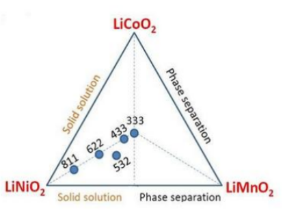 根據(jù)所含金屬離子種類的不同,三元正極材料又可進(jìn)一步分為鎳鈷錳酸鋰三元材料(NCM)和鎳鈷鋁酸鋰三元材料(NCA)兩種。由于鎳有提高材料能量密度的作用, NCM 材料根據(jù)三種過(guò)渡金屬離子占比的不同,又可進(jìn)一步分為低鎳的 NCM424、NCM333、NCM523 以及高鎳的 NCM622、NCM811等材料。NCA 中由于鋁元素含量較少,主要為鎳、鈷兩種元素,因此也為高鎳三元材料的一種。目前國(guó)內(nèi)動(dòng)力電池均為NCM體系,產(chǎn)業(yè)化進(jìn)程主要是從低鎳的 NCM333、523 等向高鎳的 622、811 方向發(fā)展,國(guó)外與國(guó)內(nèi)進(jìn)程類似,但在 622 向 811 發(fā)展階段之間有 701515 過(guò)渡。