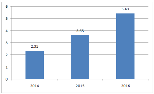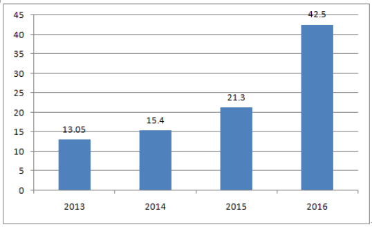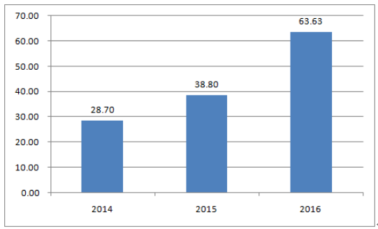 我國(guó)鋰電池負(fù)極材料產(chǎn)量增速基本維持逐年遞增態(tài)勢(shì),2016 年全年實(shí)現(xiàn)產(chǎn)量12.25萬(wàn)噸,同比增長(zhǎng)68.27% ,實(shí)現(xiàn)產(chǎn)值64 億元,同比增長(zhǎng)64% ,產(chǎn)值增速與產(chǎn)量增速基本相同。