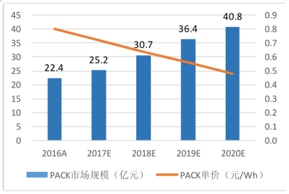 客車由于單體電池容量大,電壓等級(jí)高,因而B(niǎo)MS 成本較高,目前價(jià)格在 1.2 萬(wàn)元/套左右,乘用車電壓等級(jí)較低,成本較低,價(jià)格大約在 3000-5000 元/套左右,專用車與乘用車成本基本相同。目前三元電芯和磷酸鐵鋰電芯單價(jià)大約分別為 1.2 元/Wh和 1 元/Wh 左右,PACK 后價(jià)格大約在 1.8-2 元/Wh 左右,估計(jì) PACK 環(huán)節(jié)目前價(jià)格 0.8 元/Wh,以此為基礎(chǔ)對(duì)新能源汽車 BMS 及鋰電 PACK 市場(chǎng)規(guī)模進(jìn)行預(yù)測(cè), 預(yù)計(jì)到 2020 年,BMS 市場(chǎng)規(guī)模將達(dá) 55.47億元電,鋰電PACK 市場(chǎng)規(guī)模將達(dá) 40.8 億元,年復(fù)合增速分別為15.4%和16.2%。