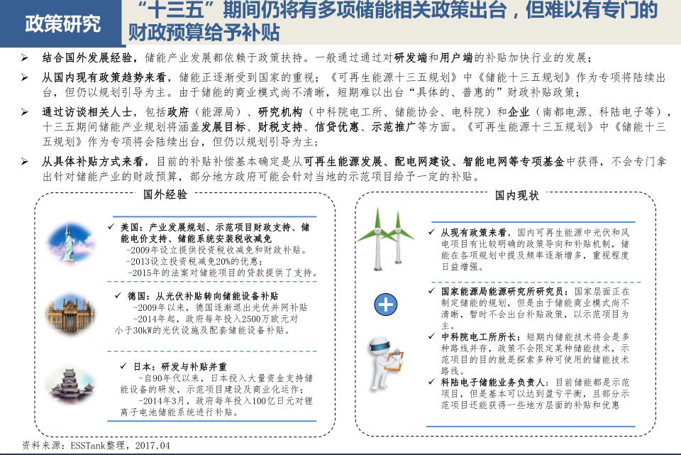 做個(gè)總結(jié):十三五期間還會(huì)有很多關(guān)于儲(chǔ)能產(chǎn)業(yè)的政策出臺(tái),但是專門(mén)拿財(cái)政來(lái)給儲(chǔ)能做補(bǔ)貼的可能性,個(gè)人覺(jué)得還是比較小的。部分地方政府可能會(huì)給某些項(xiàng)目一些當(dāng)?shù)氐难a(bǔ)貼,一事一議。現(xiàn)在很多企業(yè)在地方上做一些示范項(xiàng)目,我們認(rèn)為可能也是在當(dāng)?shù)赝ㄟ^(guò)各種方式,拿到了一些優(yōu)惠或者支持的政策。