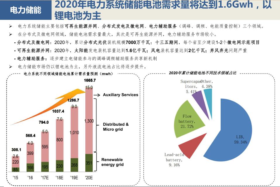 第二,它明確了儲(chǔ)能未來(lái)應(yīng)用的幾大場(chǎng)景,它對(duì)場(chǎng)景的應(yīng)用主要是在電力系統(tǒng)當(dāng)中做一些確定,一,提高可再生能源的利用水平,二,提供系統(tǒng)的穩(wěn)定性,三,用戶側(cè)的分布式的儲(chǔ)能,四,講到了能源互聯(lián)網(wǎng)。我們認(rèn)為在這幾大應(yīng)用領(lǐng)域當(dāng)中,最先用起來(lái)的應(yīng)該是在第三個(gè)領(lǐng)域,也就是說(shuō)在分布式的發(fā)電。其實(shí)我們走了很多的企業(yè),去年也有很多企業(yè)做了很多的儲(chǔ)能項(xiàng)目,大部分都是集中在用戶側(cè)這塊,也就是我們講的工業(yè)儲(chǔ)能。