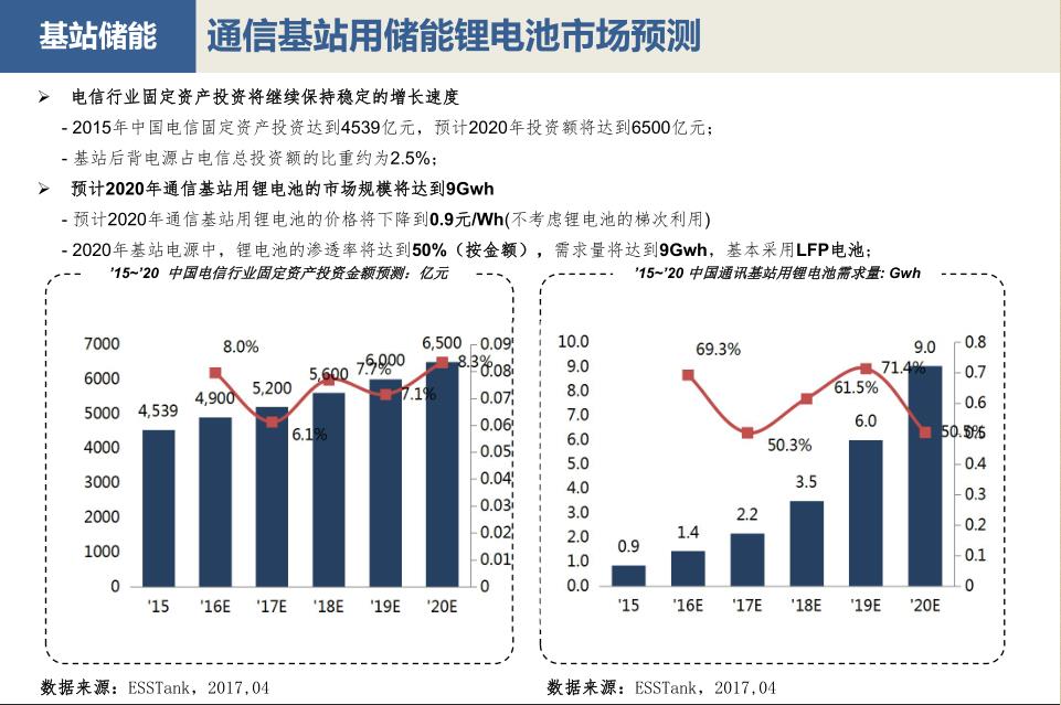 隨著通訊基站的配備,儲(chǔ)能的空間是很好去算的。首先,通過(guò)基站的投資額計(jì)算它的備用電源數(shù)量;其次,計(jì)算備用電源里面到底有多少是用鋰電池的。我們知道基站里面有鉛酸,有鋰電,還有新的燃料電池也在用。