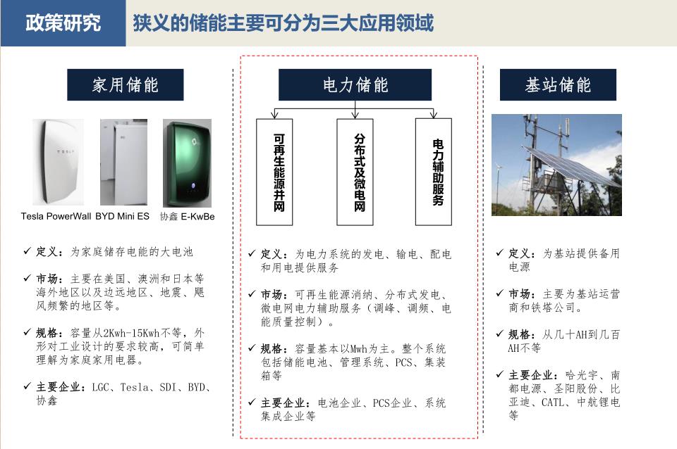 在研究?jī)?chǔ)能產(chǎn)業(yè)之前,我們還是要簡(jiǎn)單地把儲(chǔ)能產(chǎn)業(yè)做個(gè)分類(lèi)。廣義的儲(chǔ)能包括所有能夠儲(chǔ)存能源的載體,比如小的充電寶、大的移動(dòng)電池。今天來(lái)講的儲(chǔ)能,說(shuō)的是狹義的儲(chǔ)能概念,分為三個(gè)方面。
