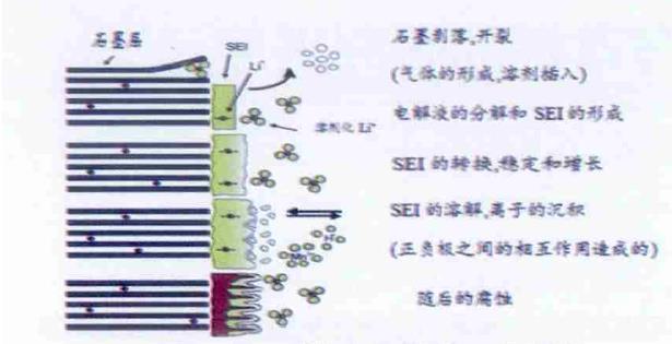 在膜的生長中,一個(gè)無效的SEI 層是困溶劑化鋰源,可以導(dǎo)致金屬鋰集群的增長。在不斷增長的SEI 中,被困的溶劑化鋰離子與電解液反應(yīng),增加表面積累的還原產(chǎn)物的濃度[9],顯著增加電荷轉(zhuǎn)移電阻[10]。在石墨表面積累的還原產(chǎn)物,降低了在SEI 層的孔隙大小,導(dǎo)致減緩了Li+ 的嵌入/ 脫嵌動(dòng)力學(xué)。整個(gè)循環(huán)過程中,SEI膜是不斷變化的,大致如下圖: