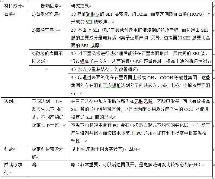 SEI膜的形成主要受到石墨、電解液(溶劑、鋰鹽)的影響,改善也是從這三個(gè)方面進(jìn)行.大致總結(jié)如下,如果是針對不同的石墨材料(人造石墨、MCMB、中間相微球)、電解液添加劑,展開較多,就不再展開。