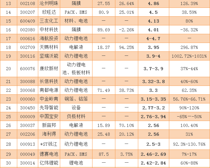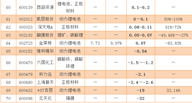 在70家已發(fā)布業(yè)績預(yù)告的企業(yè)中,凈利潤排名前10的鋰電上市公司分別是比亞迪、*ST金瑞、中天科技、天齊鋰業(yè)、佛山照明、必康股份、保千里、嘉化能源、鹽湖股份、勝利精密。