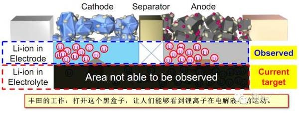 簡單地講,豐田公司發(fā)明了一種觀測方法,能夠讓人們在充放電過程中,實(shí)時(shí)觀察到鋰離子在電解液中的運(yùn)動(dòng)。這稱得上是種突破了,因?yàn)橹?,人們是看不到鋰離子在電解液中的運(yùn)動(dòng),只能猜測,論證。從看不到,到能看到,相當(dāng)于打開了黑盒子,有機(jī)會弄懂里面的機(jī)理。