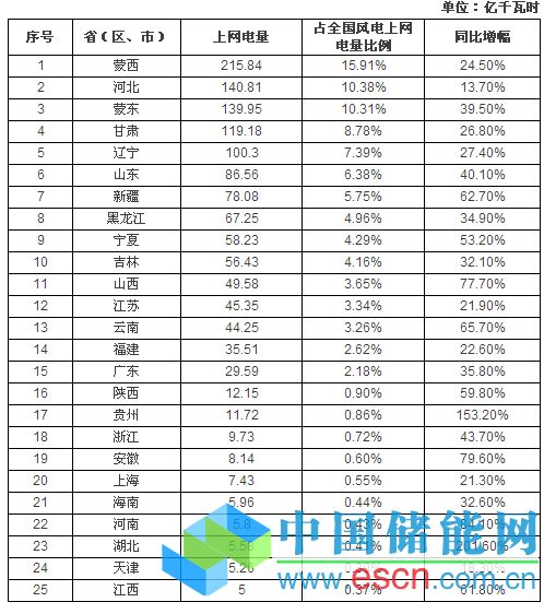 根據(jù)國家能源局統(tǒng)計,2013年全國風(fēng)電發(fā)電量1357億千瓦時,同比增長34.65%。全國風(fēng)電上網(wǎng)電量超過50億千瓦時的省份有內(nèi)蒙古、河北、甘肅、遼寧、山東、新疆、黑龍江、寧夏和吉林9個省(區(qū)),其中新疆、黑龍江、寧夏和吉林上網(wǎng)電量首次突破50億千瓦時。內(nèi)蒙古2013年上網(wǎng)電量為356億千瓦時,約占全國風(fēng)電上網(wǎng)電量的26%。甘肅省風(fēng)電上網(wǎng)電量約占本省電源上網(wǎng)總量的10%,是全國年上網(wǎng)電量比例最高的省份。