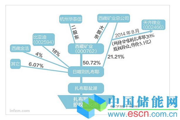 四年前,經(jīng)由西藏地區(qū)招商引資和隨后的債務(wù)重組,比亞迪股份有限公司(股票代碼002594,下稱比亞迪)和西藏金浩投資有限公司(下稱西藏金浩),以近2.5億元現(xiàn)金參股日喀則扎布耶,分別持股18%和4%;剩下6.07的股權(quán),則分散在中節(jié)能新材料投資有限公司等三家機構(gòu)手中。