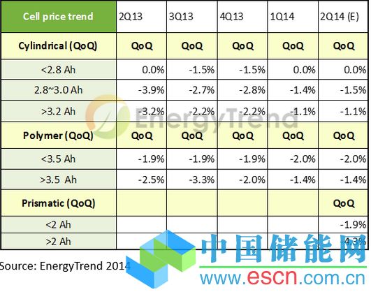 高分子電池:由于第二季新機種出貨量不高,高分子電池價格依然下滑。盡管中國生產(chǎn)電池芯供給量增加,但因品質(zhì)因素大多停留在山寨與白牌的智能手機與平板,對于一線品牌的高分子電池價格影響不大,第二季價格跌幅約在 1.5-2%。