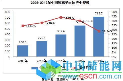 得益于低廉的生產(chǎn)成本和強(qiáng)大的加工制造能力,2000年以后全球的鋰離子電池制造逐步由日本和韓國向中國轉(zhuǎn)移。2013年,中國鋰離子電池的產(chǎn)業(yè)規(guī)模達(dá)到715.70億元,同比增長28.54%左右,賽迪顧問預(yù)計隨著日本和韓國等鋰離子電池企業(yè)將電池的生產(chǎn)基地轉(zhuǎn)移到國內(nèi),中國鋰離子電池產(chǎn)業(yè)規(guī)模將保持較快的速度增長,到2015年將突破1000億元。