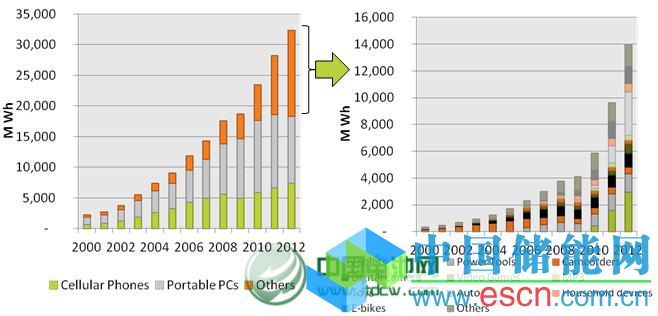 上圖中右圖是其他市場總消耗量的構(gòu)成情況。在2012年其他市場1,398.2萬kWh的總量中,電動汽車(Auto)用量最大,為324萬kWh,占比23.17%;其次分別是平板電腦(Tablets)、電動工具(Power Tools)和電動自行車(E-bikes),分別是293.3萬kWh、136.7萬kWh和128.1萬kWh,分別占比20.97%、9.78%和9.16%。余下的數(shù)碼相機(Digital Camera)、游戲機(Video Games)、家用設(shè)備(Household devices)、攝像機(Camcorders)、玩具(Toys)、MP3及其他(Others)分別為102.9萬kWh、66.8萬kWh、64萬kWh、54.9萬kWh、36.9萬kWh、29萬kWh和161.6萬kWh。