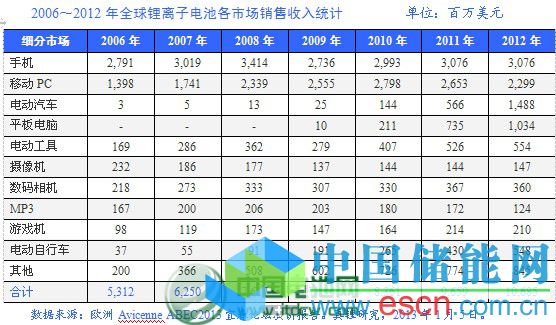 從上表可以看到,Avicenne的數(shù)據(jù)顯示,平板電腦用鋰離子電池市場是各細分市場中發(fā)展速度最快的,2012年較2011年增長了40.63%。電動汽車鋰離子電池市場也獲得了高速發(fā)展,2012年較2011年增長了34.75%。由于智能手機的快速發(fā)展,數(shù)碼相機、MP3、攝像機、游戲機等市場受到了明顯影響,這些市場對鋰離子電池的需求量出現(xiàn)了增長停滯甚至下降的情況。