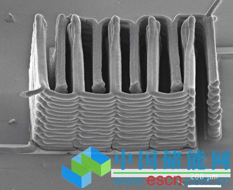 她打印出的鋰離子電池只有一平方毫米大小,但性能上跟普通電池一樣好。因?yàn)閯⒁姿鼓軌蛟斐鑫⑿〗Y(jié)構(gòu),結(jié)構(gòu)定位精確到100毫微米,從而體現(xiàn)出要大得多的電池的結(jié)構(gòu)。
