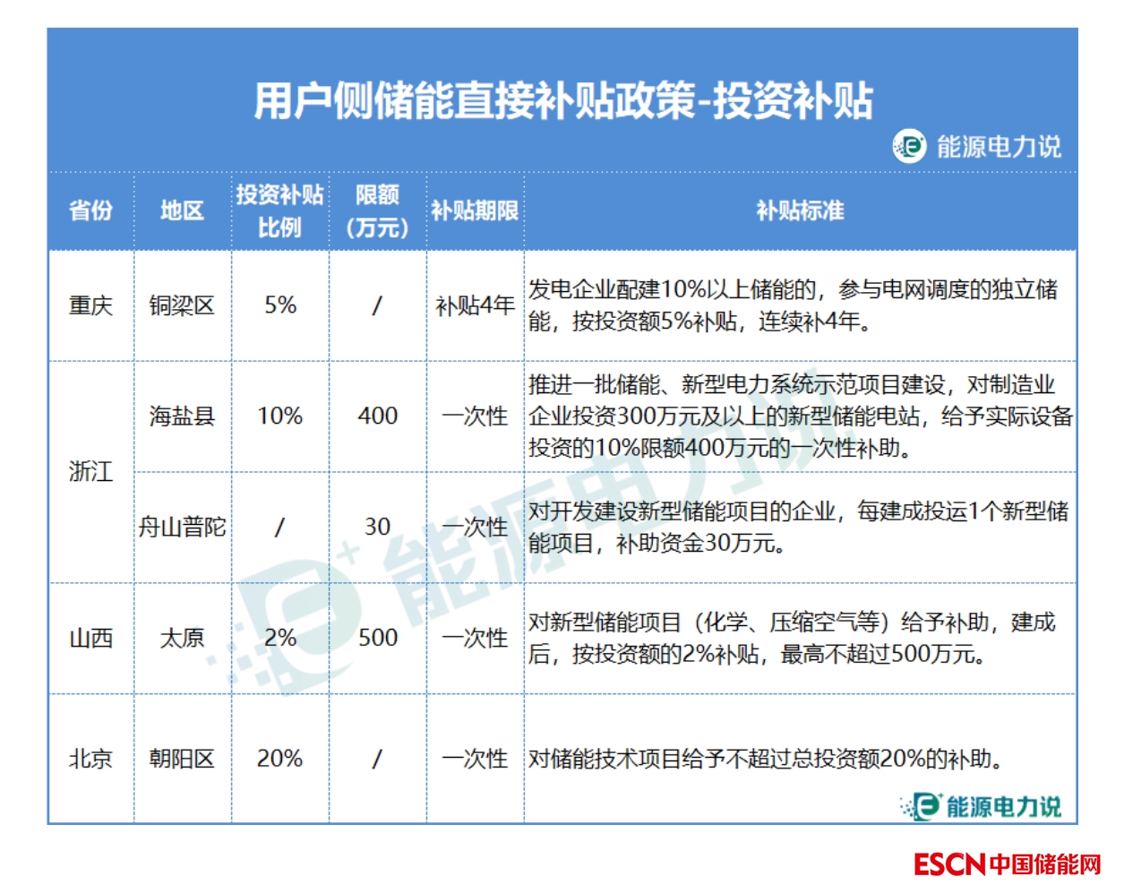 在投資補貼方面,重慶、浙江、山西、北京等多省地區(qū)出臺了儲能投資補貼政策,投資補貼比例在2%-20%之間,單個項目補貼限額在30-500萬元之間,補貼期限多為一次性補貼。其中浙江海鹽縣在《海鹽縣貫徹<浙江省推動經濟高質量發(fā)展若干政策>承接落實方案(征求意見稿)》提出,對對制造業(yè)企業(yè)投資300萬元及以上的新型儲能電站,給予實際設備投資的10%限額400萬元的一次性補助;重慶t銅梁區(qū)對參與電網調度的獨立儲能,按投資額5%補貼,連續(xù)補4年。