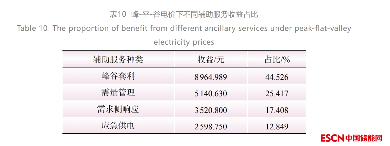 該部分內容僅考慮電價政策的變化對儲能經濟效益的影響,不改變儲能在容量配置階段的參數(shù)設定值。在需求響應和應急供電約束中同樣設置13:00—15:00為需求響應時段、15:00—16:00為保電時段。4種不同輔助服務的效益對比如表10所示。