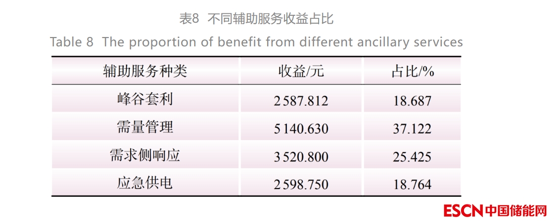 在上述章節(jié)的優(yōu)化配置下,用戶側儲能8月份不同輔助服務的收益對比如表8所示。